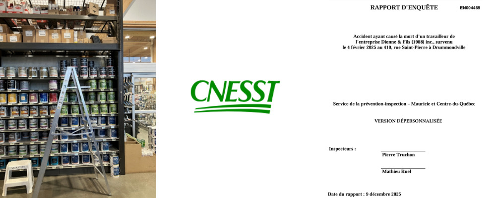 La Commission des normes, de l’équité, de la santé et de la sécurité du travail (CNESST) vient de rendre publiques les conclusions de son enquête sur un accident survenu en février 2025 et ayant coûté la vie à un travailleur de la quincaillerie Dionne & Fils (1988) appartenant au Groupe Gilles Jean.
