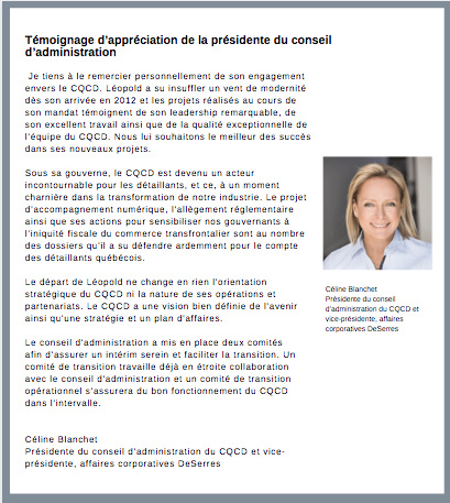 M. Turgeon estime que ses sept années au sein du CQCD ont été parmi les plus enrichissantes de sa carrière, tant sur le plan professionnel que sur le plan humain. « Le CQCD est une organisation extraordinaire qui est la mieux placée pour défendre les intérêts du commerce de détail, pour le valoriser et mettre en lumière la qualité de ses emplois », a-t-il souligné.