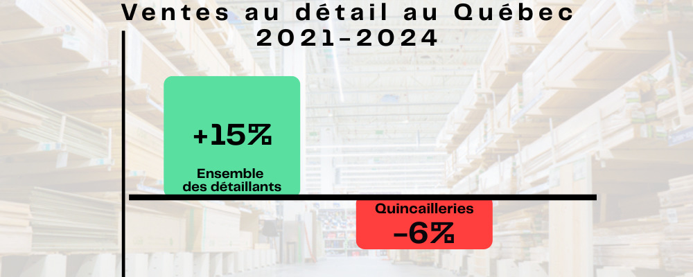 Quand on scrute Statistique Canada et qu’on zoome sur la croissance des ventes entre 2021 et 2024, on remarque que nous sommes les canards boiteux sur l’ensemble du commerce de détail au Québec : les quincailleries et centres de rénovation ainsi que les détaillants de meubles, les boutiques de revêtements de sol, les jardineries, les spécialistes de portes et fenêtres ont en commun d’afficher une croissance négative.