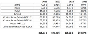Chaque mois, l’AQMAT vérifie les prix affichés par cinq sites web de bannières pour prendre un « polaroïd » des prix du marché à partir d’un échantillonnage de huit matériaux de construction communs à plusieurs projets de construction.