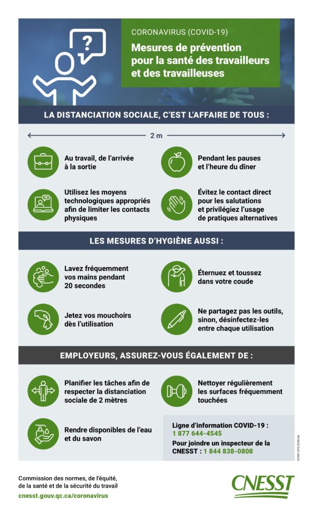 Le Guide pour les chantiers de construction est accessible en cliquant ici À noter qu’il n’est pas recommandé pour un travailleur de la construction de porter un équipement de protection individuelle spécifique (gants, masque, couvre-tout) pour se protéger de la COVID-19, sauf pour des situations particulières. Les meilleures mesures à appliquer demeurent de se laver les mains souvent et d’éviter de toucher à son visage.