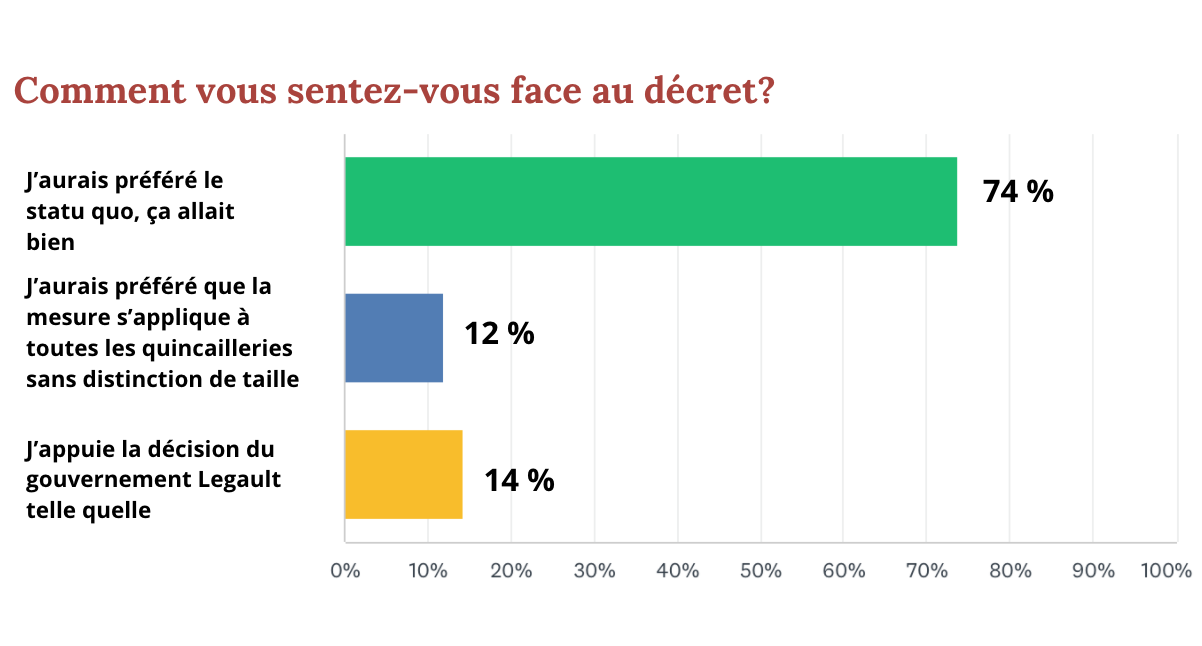 Le verdict des répondants à cette enquête express est sans appel : seulement 12 % appuient cette idée d’extension mur à mur alors que 74 % maintiennent que la preuve vaccinale ne devrait pas être requise pour entrer dans une quincaillerie en raison du caractère essentiel de cette activité. Les autres répondants (14 %) apprécient le décret actuellement en vigueur.